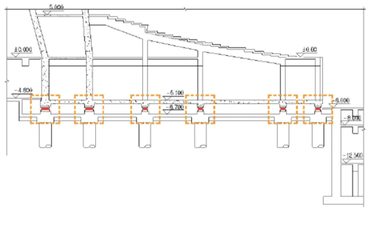 其次,歌劇廳建造時需要對地基作特別處理以消除結構傳播噪聲(ground-bornenoise),即附近地鐵、路面交通等振動帶來的噪音。圖中黃色虛線框起的阻尼器將結構震動帶來的動能轉化為熱能,加速垂直方向振動頻率的衰減,從而降低噪聲影響。