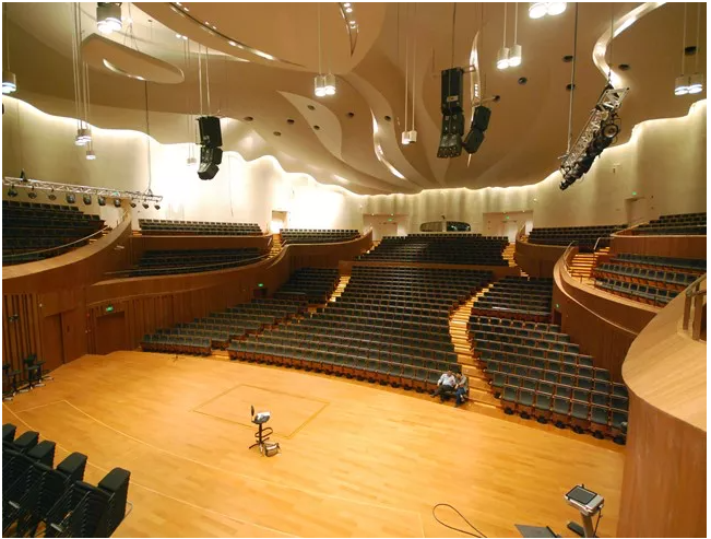 例如,江蘇大劇院音樂廳就主要采用的是線陣列擴聲器,在場地較小、輔助擴聲器較少的情況下也能覆蓋所有觀眾席位。