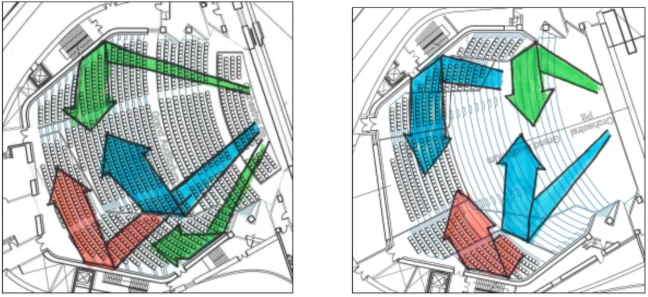 下圖是歌劇廳的一階反射聲,即聲音從舞臺擴聲器發出后經過第一次反射的路徑分析。從各個箭頭的指向與長度可以看出,聲音到達各區域座位距離、時間相當,也就是各區域觀眾都能有相似的聽覺體驗。