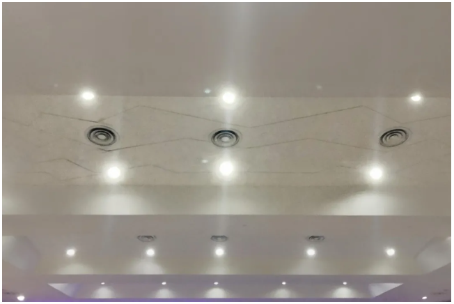 考慮到高層觀眾離天花更近,回音影響更大,在騎樓、高層處的天花與墻面需要更強的吸音效果。設計師巧妙地將空調回風口與燈架一起設置在天花板與兩側上方,既完成了座椅下送風、頂棚回風的節能空氣處理系統,又通過凹凸不平的墻面削弱了回聲。