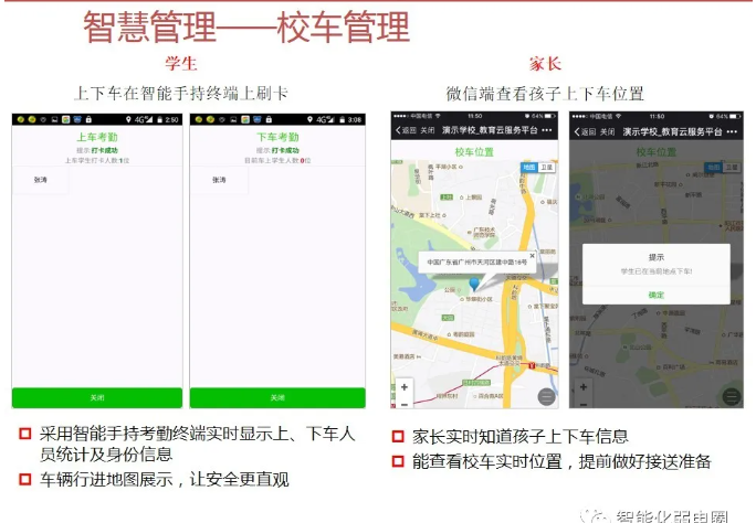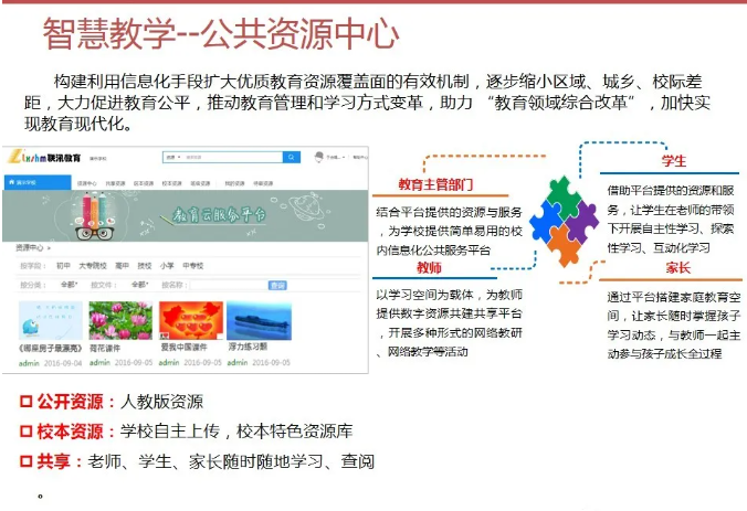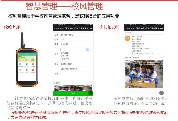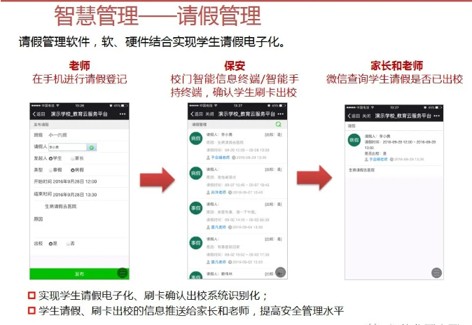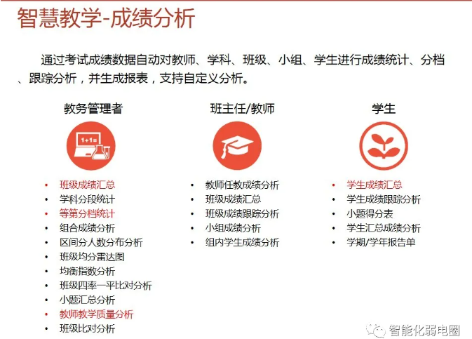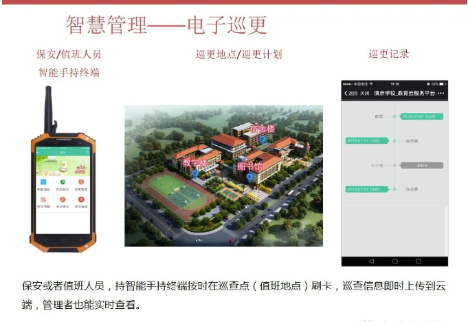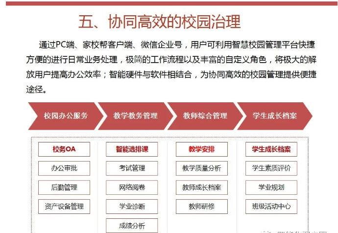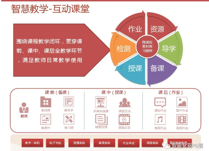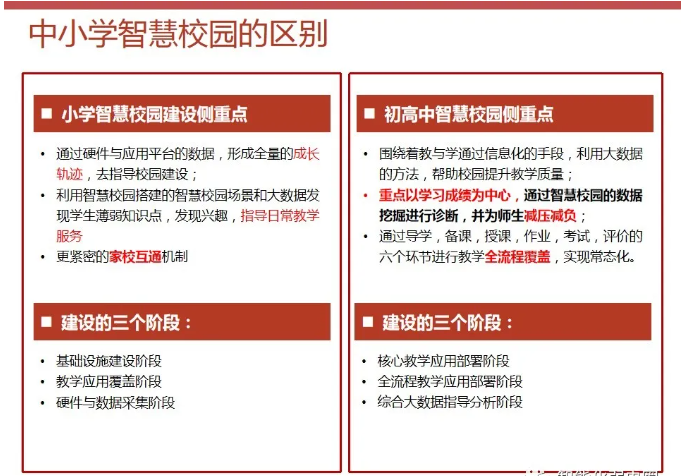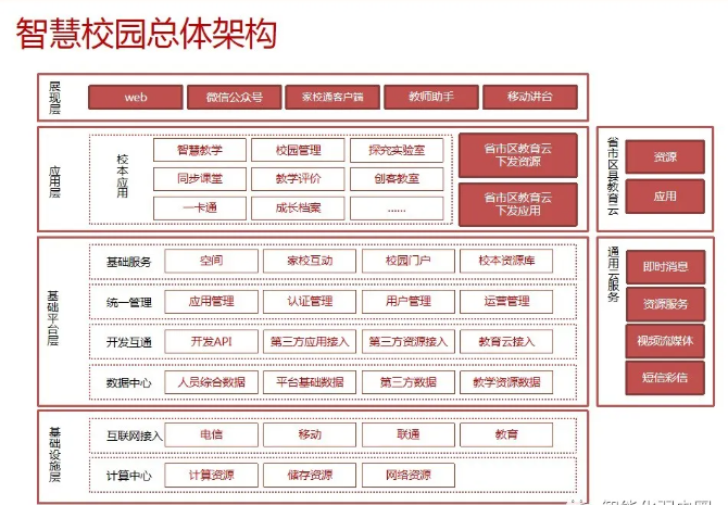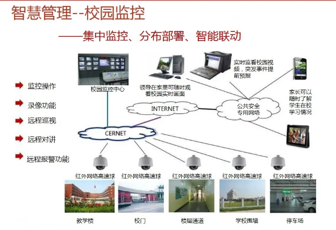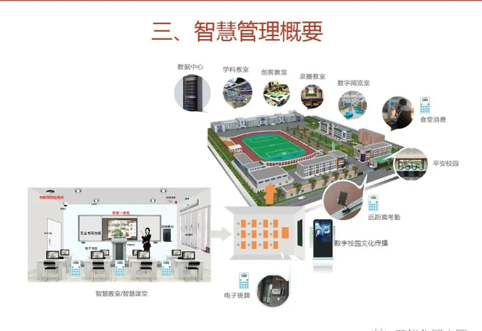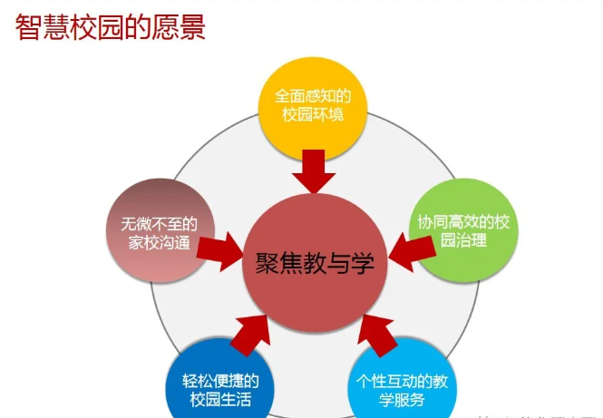 一套完整的智慧校園解決方案,不僅僅是校園傳統的智能化弱電系統建設,還包括智慧校園能為校園管理者、教師、學生、家長等各類角色提供服務。