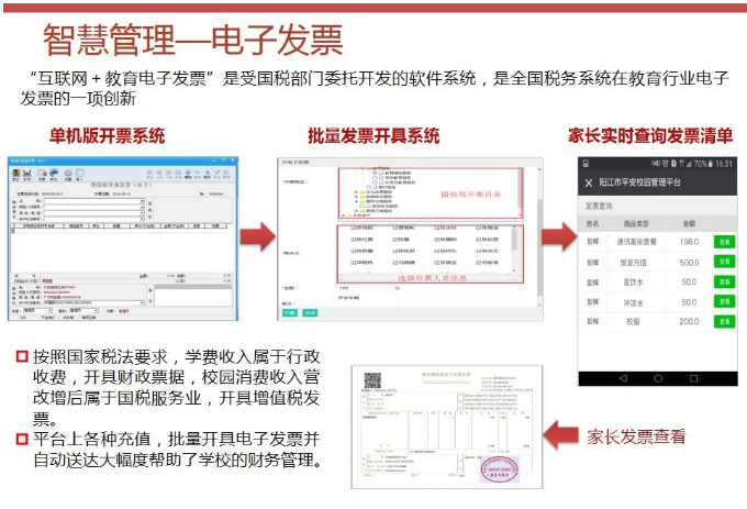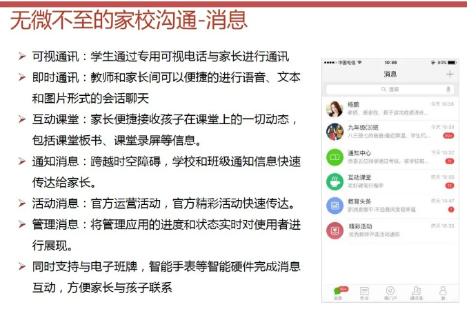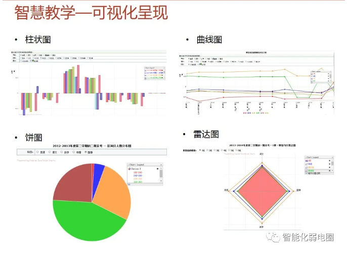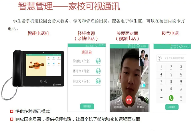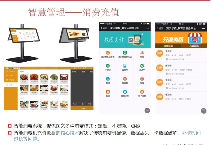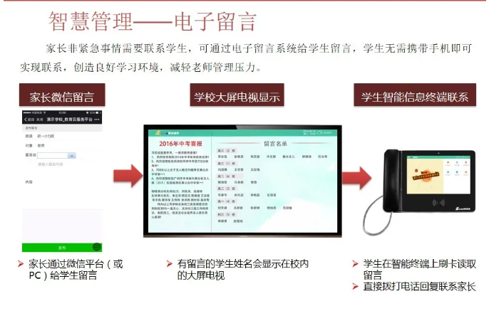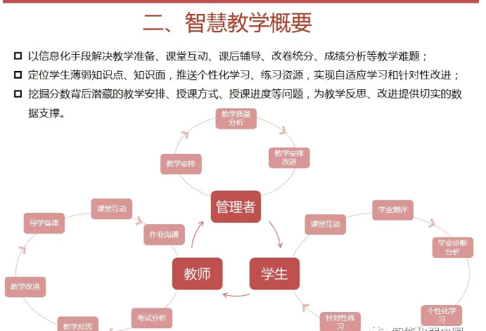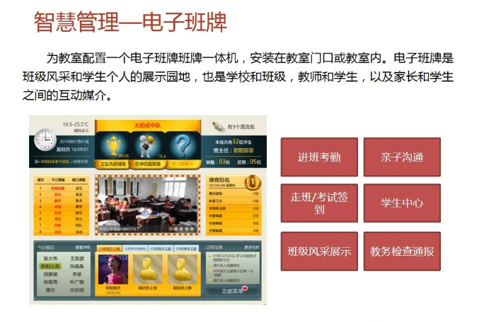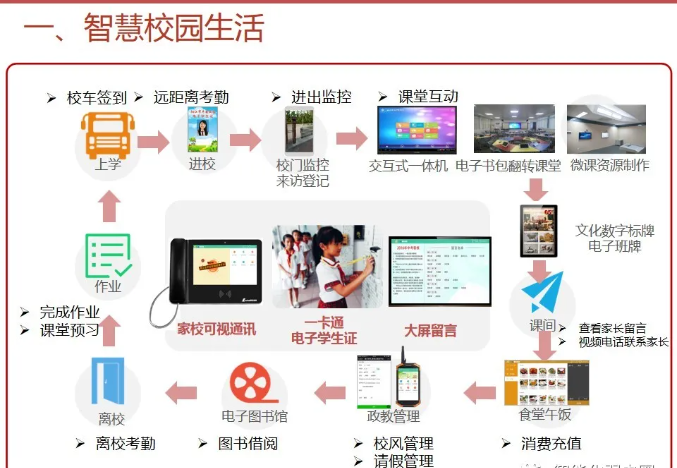 智慧校園為校園管理者提供,教學與管理互聯互通,校園管理一體化閉環,學業診斷、成績分析、教室設備使用分析;為教師提供豐富的教育云平臺,精品資源,備課更加輕松,更緊密的家校互通機制;為學生提供考勤、門禁、消費一體化智能互動,自主安排選課、選餐、探究式學習,完整的成長檔案,多維度素質評價;家長提供學生在學校軌跡知曉、學生進校、進班、答題、離校各個節點記錄;學生成績多維度分析,家校溝通無縫對接。