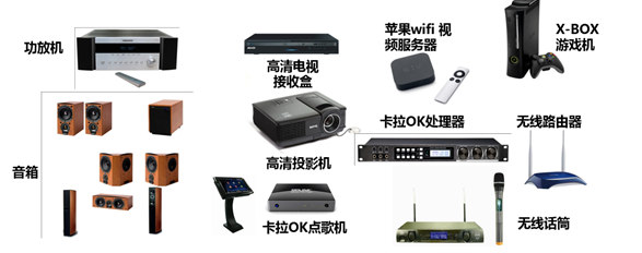 1)投影機、高清藍光播放機、點歌機、互動游戲機、高清電視機頂盒、卡拉OK機、無線話筒、功放機、空調機、網絡路由器等等多達十幾種設備;