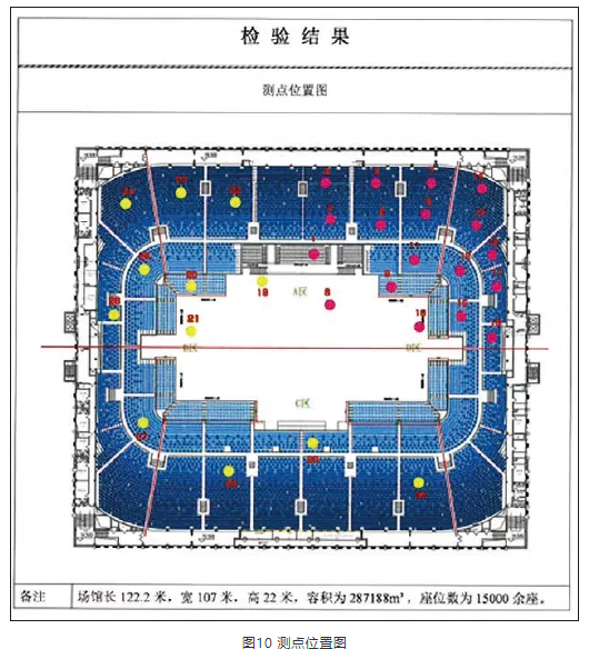 施工完畢后,進行了現(xiàn)場實測,測點如圖10所示。經(jīng)現(xiàn)場測試,擴聲系統(tǒng)聲壓級可基本達到設(shè)計值,其他測量結(jié)果見圖11、表2—表4。測試結(jié)果反映,該項目達到設(shè)計目標及行業(yè)相關(guān)標準指標。