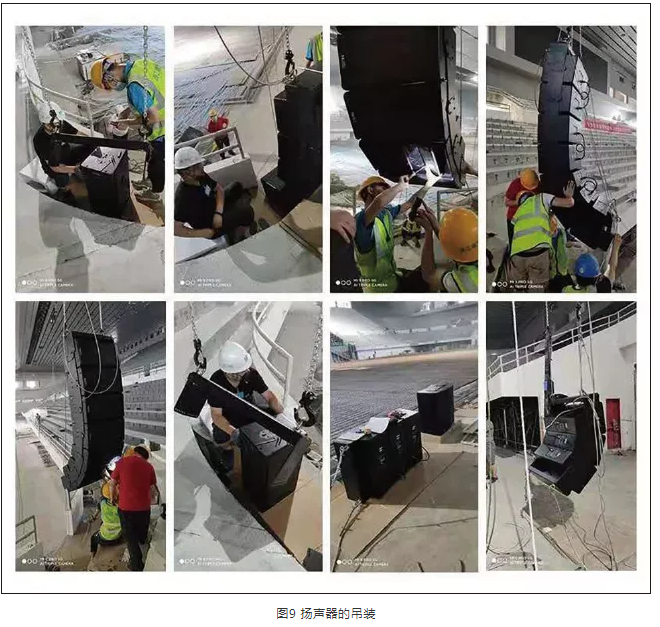 比賽場地上空設(shè)置有巨大的投影幕布,面積與比賽場地近乎一樣。為此,對場地擴聲系統(tǒng)提出了多種方案。其中,一種方案是調(diào)整揚聲器的覆蓋角度,以避免因投影幕布反射形成的回聲,但受整體環(huán)境所限,難以實現(xiàn)。另一種方案是考慮采用透聲幕布,揚聲器吊掛在透聲幕布上方,但會影響投影效果。在實施中,最初采用透聲幕布,經(jīng)過多方溝通,方案幾經(jīng)調(diào)整,在安裝位置與投影幕布之間取得平衡,最終采取分段式幕布加揚聲器吊掛調(diào)整,將揚聲器吊掛與各幕布之間,并選用8只小尺寸、高聲壓的點聲源揚聲器P12,既不會影響投影效果,也可滿足聲場覆蓋,達到設(shè)計指標。