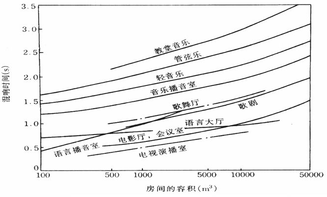 同時,近年來室內(nèi)裝飾材料的日益更新,吸音系數(shù)較高的材料被廣泛應(yīng)用,使得大量廳堂的混響時間普遍偏小。由此可以看出,這種設(shè)計原則的出發(fā)點(diǎn)和受客觀條件的影響都是不必懷疑的。
