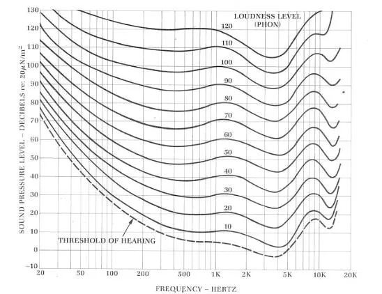 在進(jìn)行聲壓級計算前,必須選擇一個相應(yīng)環(huán)境下合適的基準(zhǔn)聲壓級,而基準(zhǔn)聲壓級的選擇必須了解正常人耳的等響曲線,即“Fletcher-Munson curves(弗萊徹芒森曲線)”。